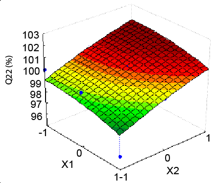 Q22 = 100.30 - 0.561 (x1)+1.268(X)2)-0.308(X1X1)- 0.208 (2X2x1X2)