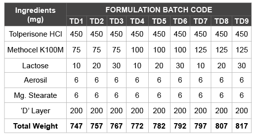 本研究的目的是制备盐酸托培松和双氯芬酸钠双层缓释片,用于有效治疗急性肌肉骨骼痉挛或急性腰痛患者,试图提高生物利用度,获得最大的治疗效益,并适用于更好患者的长期治疗t治疗依从性[5,6]。