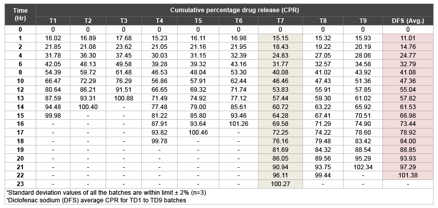 由于药物从片剂表面快速溶出,所有批次均表现出药物的初始爆发性释放。制剂批次T7 23 h后释放率为100.27%。最后,优化后的双氯芬酸钠层溶出度数据如表8和图2所示。含双氯芬酸钠的双层片剂均有良好的释放特性。在TD1 ~ TD9处方批次中,双氯芬酸钠层22 h平均释放度为101.38%。