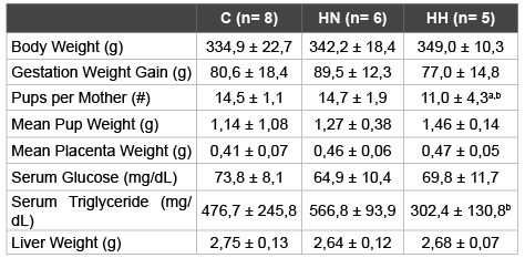 在喂食上述HS饮食的雌性Sprague-Dawley大鼠中成功诱导肥胖状态。与喂食对照饮食的大鼠相比,喂食8周后,HS样本的累积体脂量急剧增加。HS组(HN+HH)记录的平均值为32,5±1,5 g体脂和12,2±0,8%体脂百分比,而对照组记录的平均值为27,5±0,8 g和10,2±0,6%。此外,母亲受到缺氧治疗的影响(表2)。与常氧组(C和HN)相比,缺氧治疗(HH)似乎会导致每只母亲的平均幼崽数量略有减少(分别为-24%,p<0.1和-25%,p<0.1)。相反,仅与HS饮食组(HN和HH)相比,低氧治疗(HH)似乎会导致母亲血清TG水平的下降趋势(-47%,p<0.1)。最后,低氧治疗(HH)与两个常氧组(C组和HN组)相比,似乎会导致母体TyG指数下降(-5%,分别为p<0.1和-6%,p<0.05),HS饮食组之间的关系具有统计学意义(图1)C组和HN组的TyG指数分别为9,7±0,4和9,8±0,3,而HH组的指数为9,2±0,3。其他变量无统计学显著影响。