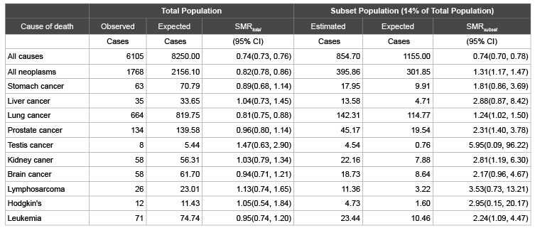 以下数据来自已发表的职业人群[2]的队列研究。这里的例子包括九种不同预期死亡人数及其smr风险的疾病。5种疾病(包括所有死亡原因)的标准死亡率高于1,7种疾病(包括所有死亡原因)的标准死亡率低于1。与美国普通人群相比,没有一个smr显著高于1。问题是,“我们会不会错过某个工人子集的任何风险?”例如,大约14%的研究人群接触到某种工业过程,“其他化学制浆”,化学制浆除了硫酸盐和亚硫酸盐制浆。实际上,子集可以用任何定义来定义,比如一组接触到某种产品、工作区域或一组化学品的工人。根据目前的数据,我们能否找出占人口14%的子集中是否存在潜在的风险?子集中可能隐藏的最大smr及其置信区间的计算方法假设其余人群中的风险为零值等于所有死亡原因0.74,如表1所示。结果表明,一个子集,是研究人口的14%,可能会统计所有肿瘤检测隐藏的风险(:阶梯短环到超级扁环1.31,95%置信区间CI: 1.17, 1.47),肺癌(:阶梯短环到超级扁环1.24,95%置信区间CI: 1.02, 1.50),前列腺癌(:阶梯短环到超级扁环2.31,95%置信区间CI: 1.40, 3.78),肾癌(:阶梯短环到超级扁环2.81,95%置信区间CI: 1.19, 6.30),和白血病(:阶梯短环到超级扁环 2.24, 95% CI: 1.09, 4.47), if internal comparisons are used in the further analysis, since the all cause of death for the entire study population is assumed as a null risk value in the calculations. The risks in a subset of 14% of the population for stomach cancer, testis cancer, brain cancer, lymphosarcoma, and Hodgkin’s disease, would not be statistically detectable.
