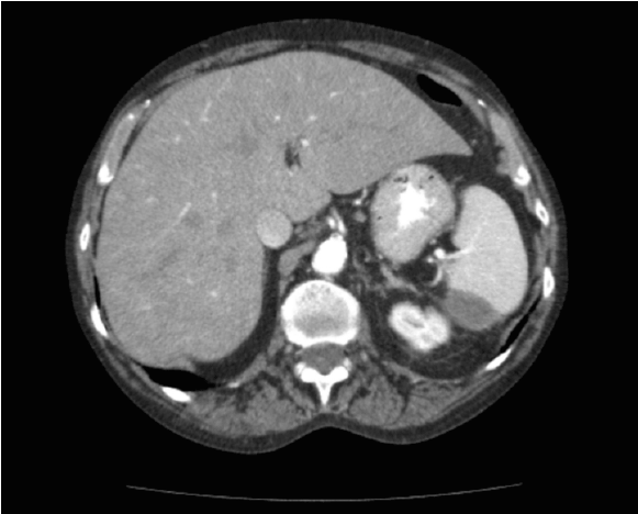 由于持续的腹痛,第一次评估后6小时,外科会诊医生进行了评估。病人报告说四天前做过结肠镜检查,否认以前有外伤。手术小组的评估,发现一个略圆的腹部,腹部有保护,并有肠音。脐周及腹侧未见瘀斑。一项新的对照血液分析显示,6小时内血红蛋白下降了1.3点。重新评估CT扫描后发现脾脏被膜下血肿,无活动性出血迹象(图2)。患者被送入ICU进行密切监测;不需要手术干预。她在重症监护室呆了48小时,需要输血两个单位的红细胞。患者血流动力学保持稳定,疼痛逐渐好转,于6月出院th就在她入院的第二天。出院一个月后随访CT显示血肿明显改善(图3)。