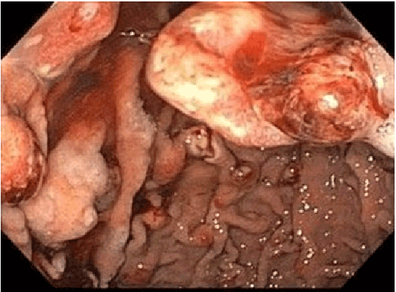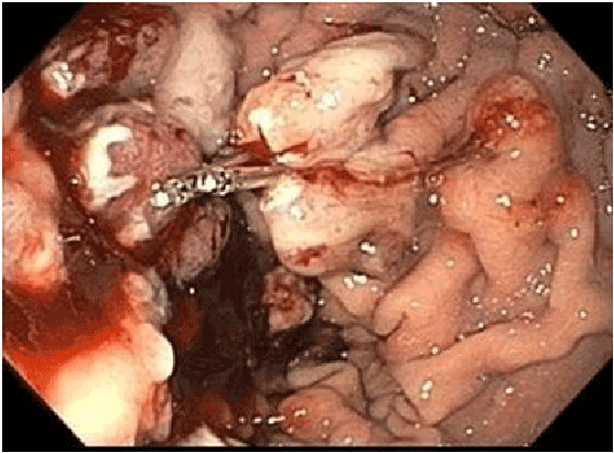 患者在8个月后被提出,患有疲劳的抱怨,发现HGB为6mg / dl。进行EGD,其揭示了大约1至5cm的十五个大的易碎培训胃息肉,其尺寸是主动渗出血液的(图1和2)。通过放置endoclips来实现止血(图3)。