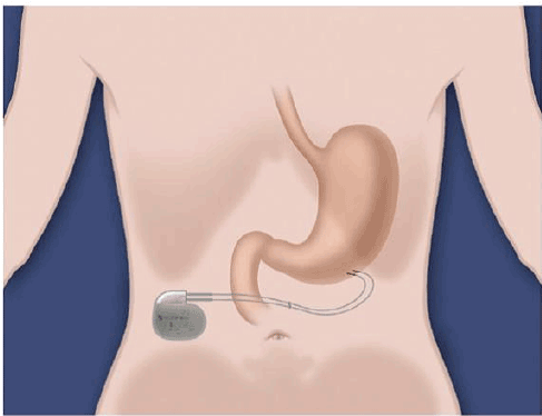 另一个概念是内镜下放置GES设备。目前,通过内窥镜放置永久性胃电刺激装置是不可用的。然而,在通过手术[13]永久放置之前,通过内窥镜放置临时设备来评估患者是否会对电刺激有反应。一个研究小组已经在猪身上设计并测试了一种微型胃神经刺激器[14,15]。此外,他们还制作了五种微型装置的内镜植入方法。如果我们能在未来将这种设备移植到人类身上,这将为我们提供一种侵入性更小的放置选择。该装置通过一根超过管置入胃内,其中有2个GES电极连接到胃粘膜,并用内夹固定。该装置和技术可能成为胃轻瘫的胃刺激标准[14,15]。类似地,目前放置刺激电极的永久性胃电起搏是通过开腹手术或腹腔镜。然而,内镜下放置可以在没有全身麻醉的情况下放置,这反过来可能会促进GES的更广泛使用。 The neutrostimulator device could be placed with local anesthesia in a subcutaneous lower abdominal pouch [16].