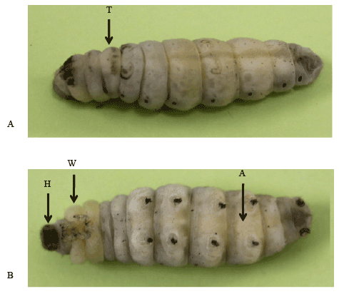 图1:以下物质W3中期幼虫。A.箭头表示胸廓表皮标本解剖位置。B.箭头指示腹部表皮(A)、翼盘(W)、头囊(H)标本的位置。