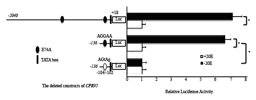 通过20E脉冲处理,含有CPR95上游2040 bp区域的质粒显示了更高的启动子活性(图4)。含有推测的E74A结合位点的缺失结构(CPR95-136)也显示了类似的活性(图4)。因此,我们使用CPR95-136对该结合位点进行了突变。结果显示启动子活性降低(图4)。未添加20E的培养基中CPR95启动子区荧光素酶活性降低到添加20E的培养基中。这表明突变消除了被认为是E74A效应的20E脉冲效应。这一结果强烈提示CPR95的启动子活性受E74A调控。