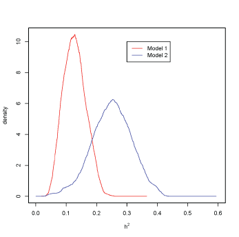 图1:模型1红色和模型2蓝色的遗传力密度。