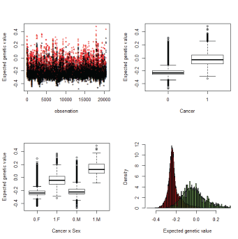 在癌症遗传学中存在添加剂组分,这对于明尼苏达乳腺癌数据集来导致0.1或0.24的遗传性,这取决于模型规格。
