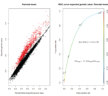 图5:父母平均预期遗传值与后代预期遗传值。红色,癌症,左面板。使用父母平均EGV的ROC曲线,右面板,模型2。