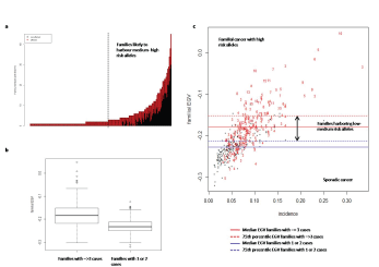 具有1或2例癌症病例(通常被视为散发)的家庭的中位EGV分别为-0.23(-0.25,-0.21,25和75个百分位数,而患有3个或更多案例的家庭中位数(哪个depending on the relationship of affected individual’s would be considered as having a hereditary component) was-0.18 (-0.21, -0.15, 25 and 75 percentiles respectively) (Figure 7b) The median EGV is significantly higher in families with 3 or more cases (-0.18) than families with 1 or 2 cases (p<0.001). As demonstrated in figure 7c we have used these values as criteria to classify and define families as sporadic or with a hereditary component. We have classified those families with an EGV below the median value of families with 1-2 cases as sporadic cancer families. The families with a hereditary component are defined as those with an EGV above the 75th只有1或2个病例的家族的EGV百分位。我们进一步将具有遗传成分的家族定义为可能具有高风险等位基因(如BRCA2突变)的家族,即EGV大于75的家族th百分比的家庭的百分比为3个或更多案例。以及可能涉及低媒体风险等位基因的家庭,即75之间的EGV的家庭th有1或2个病例的家庭百分位数和75th3例或3例以上家族的百分位。值得注意的是,有3-5例癌症家族的EGV中值在散发性癌症范围内。这些家族中的癌症聚集似乎没有遗传成分,可能是由于共同的环境风险因素。因此,这些家族中的基因检测将e不适当,该模型提供了一种在决定进行基因检测之前评估这些家族遗传成分的工具。