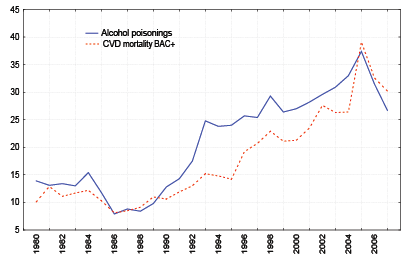 图2:白俄罗斯bac阳性心血管死亡率和致命酒精中毒的趋势。