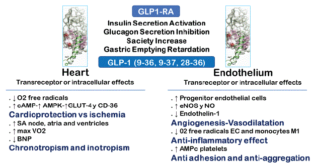 图5:GLP1受体激动剂的“经典”效应总结。并总结,研究最多的影响心脏和内皮细胞。所有这些作用都能产生抗动脉粥样硬化的效果。