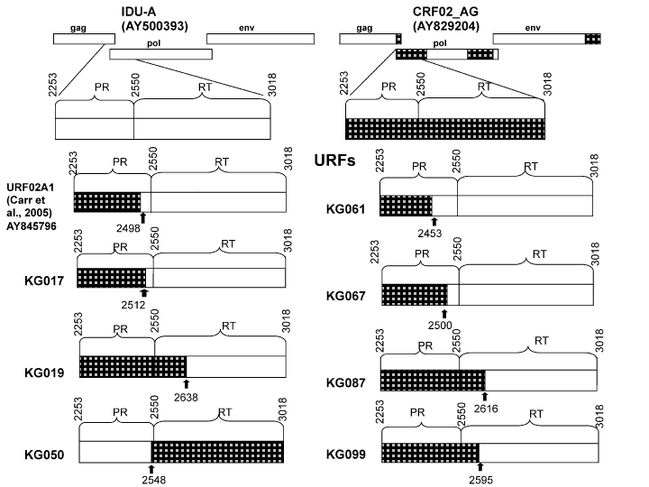 图3:吉尔吉斯斯坦发现的A亚型(IDU-A)和CRF02_AG重组体的PR-RT基因组区域结构。亲本株分别为白色(IDU-A)和黑色(CRF02_AG)。重组断点的位置(相对于HXB2)显示为黑色箭头。