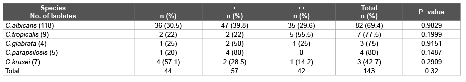 118例(82.5%)检测到磷脂酶活性。假丝酵母隔离。83.8%C.albicans表现出的磷脂酶活性为76%假丝酵母nonalbicans物种。100%C.parapsilosis> 89%C.tropicalis> 83.9%C.albicans> 75% C.glabrata > 42.8%C.krusei表现出磷脂酶活性。++磷脂酶活性最高,为60%C.parapsilosis其次是50%C.glabrata, 48.3%的C.albicans和44.4%C.tropicalis而这一比例为14.2%C.krusei见表1。