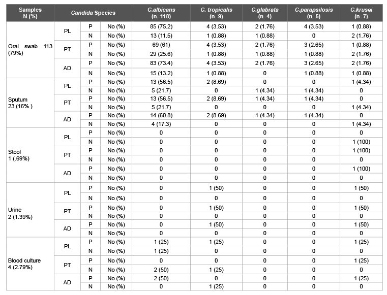 200名有症状的、经确认的人类免疫缺陷病毒(HIV)阳性成人患者,男女,怀疑有假丝酵母在新德里的Maulana Azad医学院作为研究人群。根据所涉及的器官系统采集相关临床样本,如口咽拭子、痰、血、尿、CSF、粪便,直接镜检、真菌培养和血清学。采用生化方法对酵母菌分离株进行鉴定和形态鉴定。