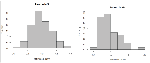 代表参与者对每个项目的实际同意比例(以及模型估计比例)的观察平均值按从低到高的顺序排列(表1)。项目5的同意比例最低,为0.55(55%的参与者同意),最后一个项目的同意比例最高,为0.86(86%的受试者同意)。Rasch平均值代表受试者同意的模型估计部分。模型估计平均值与观察平均值相同或非常接近,表明模型数据拟合良好。