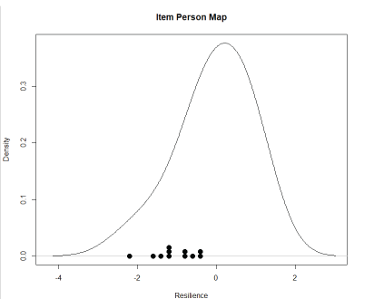 单维度假设要求所有项目只测量被试的一个潜在特质,即本研究中的弹性得分。局部独立假设认为所有项目都是独立的,潜在特质(即弹性得分)是唯一关联项目的因素。对ltm包中实现的二进制项进行了[49]单维性检验。如图1所示,结果表明观察到的弹性数据呈现一维结构(图1)。通过测试弹性项目[50]的项目间相关性来评估局部独立性。结果显示,在α =0.01水平(r=0.89, p<0.01),只有第10项(我比HIV更强壮,计划长寿)和第12项(我不会让HIV占了我的上风)不独立。我们决定删除第10项,将文书缩短为11个问题。