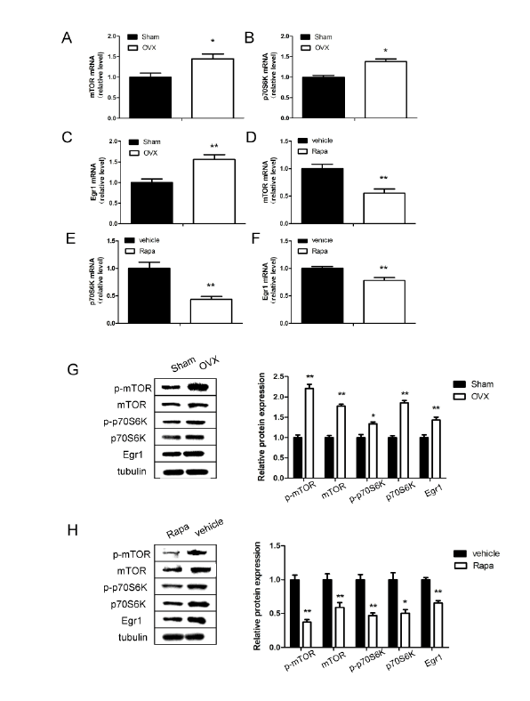 定量逆转录聚合酶链反应分析MTOR的信使RNA水平(一个和D),p70S6K(B和E)及Egr1 (C和F)分别在去卵巢和雷帕霉素治疗的小鼠中。G:卵巢切除术后12周Egr1、mTOR、p70S6K蛋白水平的Western blot分析。H:雷帕霉素治疗一周后Egr1、mTOR、p70S6K的相对蛋白水平。* * * P < 0.05, P < 0.01。