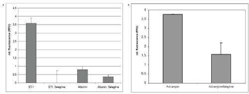 由于司来吉兰可诱导PKCα,所以ET-1刺激后用司来吉兰预处理rptec。与et -1刺激的细胞相比,上清中MiRNA15的水平显著降低,约为350倍(图3A)。以白蛋白为刺激剂,selegiline处理可使上清中miRNA15a的表达减少约50%。
