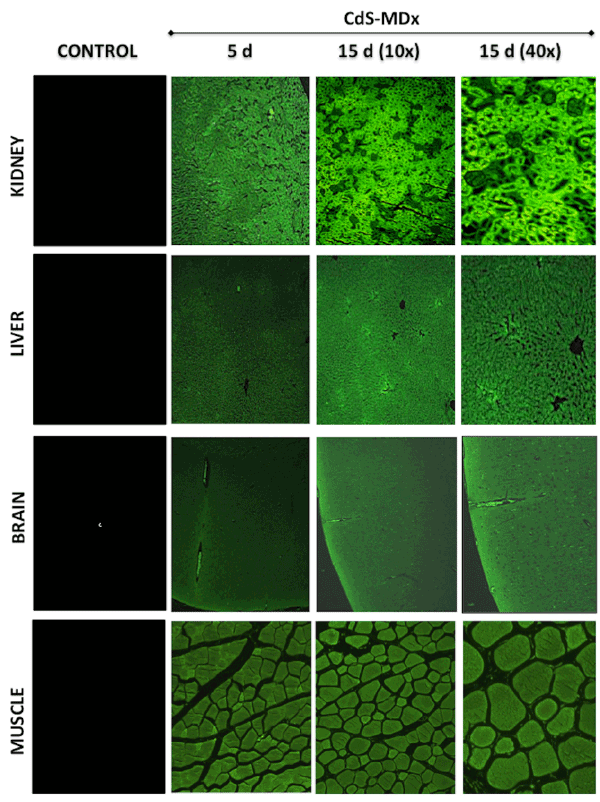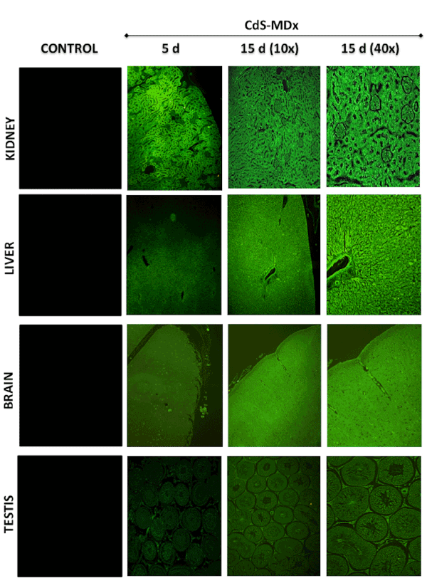 图4:荧光显微镜图像显示了CdS MDx量子点在大鼠组织中的分布和定位。这些图像属于每天注射200µg/Kg的雄性大鼠的肾脏、肝脏、大脑和睾丸,持续5天和15天。左栏显示了在荧光显微镜下观察到的对照组组织。分布和loca通过分析组织中的亮绿色成像确定CdS-MDx量子点的荧光化。治疗15天后,肾脏、肝脏和大脑中的荧光明显增加。