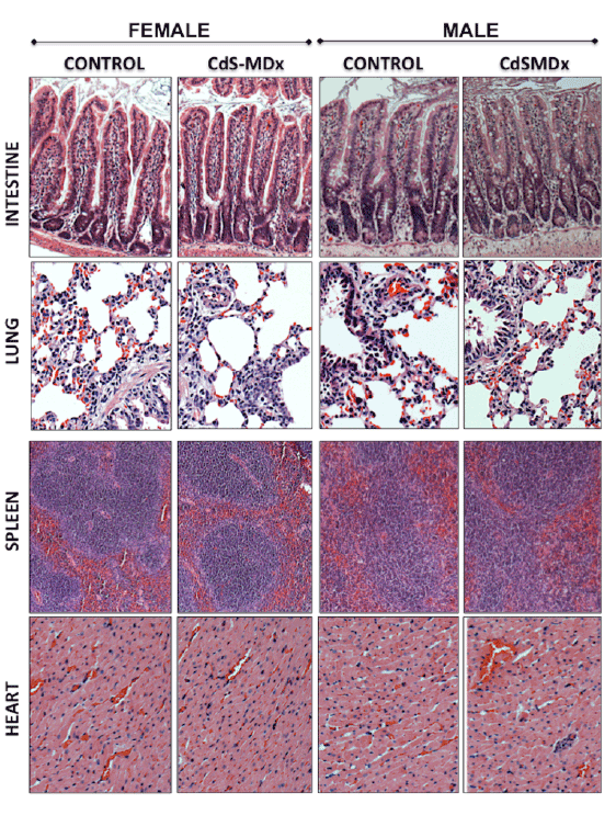 图5:用CdS MDx QDs治疗的大鼠组织的代表性光学显微镜图像。这些图像属于每天注射200µg/Kg,持续15天的雄性和雌性大鼠的肠、肺、脾和心脏。我们的分析表明,这些器官没有表现出毒性迹象。组织的完整性在用He染色后进行分析马托西林和曙红(放大10倍)。