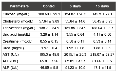 治疗后,动物被禁食一夜,并在乙醚麻醉后从心脏采集血液样本。尸检时采集的组织保存在10%中性缓冲福尔马林固定液中,并进行常规组织学检查。荧光分析,组织标本用he染色。3000 rpm离心15 min,测定血清中谷丙转氨酶(ALT)、天冬氨酸转氨酶(AST)、碱性磷酸酶(ALP)、葡萄糖、胆固醇、甘油三酯(TG)、尿素、尿素、碱性磷酸酶(ALP)等生化指标。使用商业试剂盒(ELITech,墨西哥)对接受多剂量CdS-MDx量子点的动物的肌酐和尿酸进行测量。