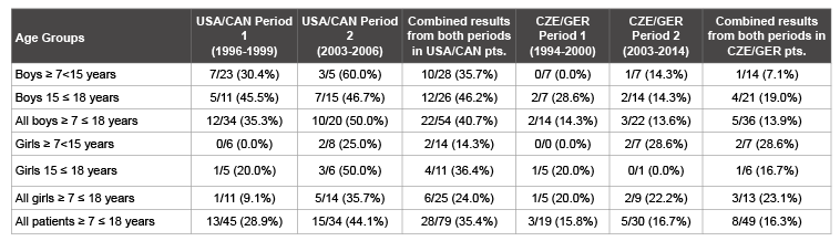 2患者群体中后续的分析表明,胡在儿童和青少年的流行变化根据性、位置和时间(表2)。在阶段1中,在美国的流行胡/可以组(1996 - 1999)和CZE /蒙古包组没有明显不同(28.9%比15.8%,p = 0.353)。然而,在第2个时期(2003-2006),HU的患病率在美国/CAN组高于CZE/GER组(2003-2014)(44.1% vs 16.1%, p=0.030),当这两个时期合并时(35.4% vs 16.3%, p=0.026)。从第1期到第2期,2个地区的SUA增加幅度相似(USA/CAN: +0.59(5.18至5.77)mg/dl)。, CZE/GER: +0.67(4.81至5.48)mg/dl.)。