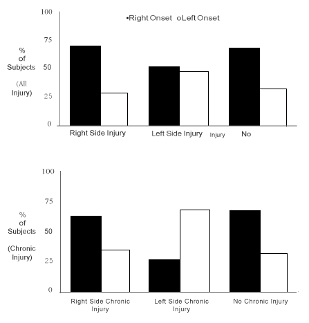 急性和慢性损伤受试者的损伤侧对起病侧没有显著影响(p=0.334,图1,顶部)。然而,损伤侧伴慢性疼痛对帕金森病发作侧有显著影响,左右侧损伤和发作的符合率分别为64%和73%(p=0.030,图1,底部)。调整利手因素后,趋势持续(p=0.067)。