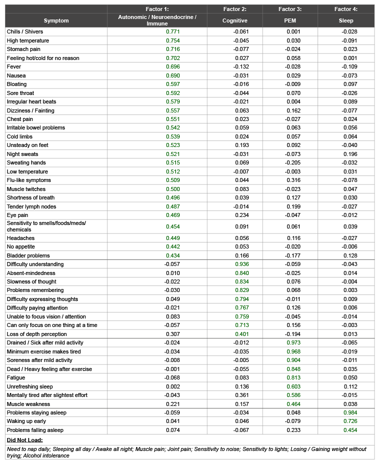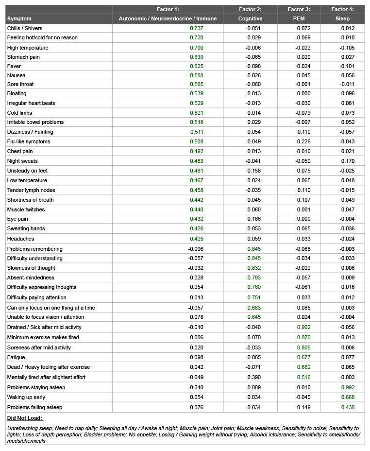 当分析合并和患者单独的样本时,发现以下四因素解决方案:运动后不适、认知功能障碍、睡眠困难和神经内分泌、自主和免疫功能障碍症状组成的综合因素。