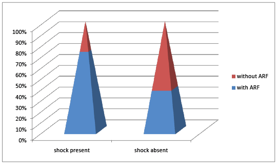 共75例,对照50例,病例控制率为1.5:1。围产期窒息发生率为7%。基线变量如胎龄、出生体重和性别优势在两组中平均分布。壁外新生儿围生期窒息发生率(70.7%:53/75,P: 0.001)明显高于壁内新生儿(29.3%:22/75)。围生期窒息最常见的危险因素是羊水胎粪染色(MSAF)(40%)和脓毒症阳性筛查(64%)。64%(48/75)脓毒症筛查阳性,对照组仅18%(9/50),差异有统计学意义(P值:0.001)如图1所示。同样,18.7%(14/75)的病例需要呼吸机支持,而对照组不需要。同样,40%(30/75)的病例出现休克,而对照组均未出现休克。71.4%(10/14)通气新生儿发生休克,差异有统计学意义(P: 0.01)。大多数需要呼吸支持的病例也有休克。 Hence, there was a positive correlation between respiratory support and shock as shown in table 1. Incidence of renal failure amongst the cases with perinatal asphyxia was 70.67% (53/ 75) and 2% (1/50) in controls, with statistical significance (X2-57.65,P 0.001值)。同样,案件的90.5%(48/53),有前氮质血症,只有9.4%(53分之5)的情况下有内在的肾功能衰竭。因此,在本研究中固有的肾功能衰竭的发病率为9.4%,并没有控制的了吧。其中53例急性肾功能衰竭(ARF),73.5%(53分之39)有非少尿型急性肾功能衰竭和26.4%(53分之14)有少尿型。因此,非少尿型氮质血症是主要的类型的情况下,中肾功能衰竭,具有统计学意义(0.001 p值)(皮尔逊卡方系数= 11.6)。对照均无少尿肾功能衰竭。虽然,病例26.4%有少尿肾功能衰竭只有9.4%有内在的肾功能衰竭。因此,不受监督少尿肾功能衰竭会导致内在肾功能衰竭,因此需要及时识别和少尿肾功能衰竭,以防止其发展成内在的肾功能衰竭的干预。那些具有内在肾功能衰竭的40%(2/5)所需的腹膜透析。其中30例26休克过ARF(86.6%)(X2:6.2, p: 0.01),如图2。此外,4%(3/75)的ARF患者有产前出血,而对照组没有。