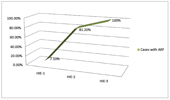 HIE- i期占22.7% (17/75),HIE- ii期占60% (45/75),HIE- III期占17.3%(13/75)。HIE-I期29.4%(5/17)、HIE- ii期33.3%(15/45)、HIE- iii期76.9%发生休克。因此,HIE-I期新生儿的休克发生率明显低于高期新生儿(p值为0.01)。同样,6%的HIE- I期、86.7%的HIE- ii期和100%的HIE- iii期新生儿出现ARF, P值为0.001,如图3-5所示。因此,较高的sarnat和sarnat分期(严重HIE)与肾衰竭的显著较高发生率相关。急性肾功能衰竭的重要决定因素是围产期窒息、阳性脓毒症筛查、休克和呼吸衰竭,需要呼吸机支持。