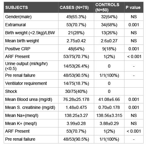 ARF的发生率与Pammi et al.[9]相似,与Girish et al.[8]和Karlowicz et al.[10]相似。其他人的发病率较低。Girish等人在I期和II期的ARF发生率均高于本研究。ARF的主要类型为非少尿,Gupta等人[2]的研究结果与本研究更接近。除Jayashree等人[7]外,所有其他研究均为非少尿ARF。病例的生化参数与Jayashree等在本研究中具有可比性,而对照组的生化参数与其他所有研究相似[9-11]。在我们的研究中,病例和对照组的平均血尿素水平显示,病例的血尿素水平明显高于对照组。我们的研究结果与之前的研究具有可比性[2,7,8,11]。在本研究中,血清电解质在两组之间的分布类似,这与以前的研究具有可比性。有三个新生儿有高血钾,没有钠异常。