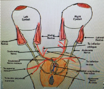 动眼神经,控制上睑提肌和六头外肌,上直肌,下直肌,内直肌和下斜肌中的四个。这源于在脑第三神经核。动眼神经麻痹可导致从病变沿其在中脑的动眼神经和眼眶内眼外肌(图5)之间的路径的任何地方。损坏去往眼外肌的轴突会导致内直肌麻痹[3]。