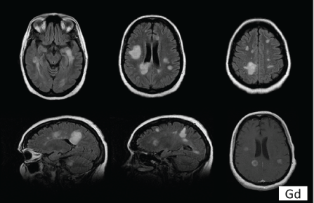 图2:脑MRI (FLAIR和Gd-T1)。小脑幕上、下多发高强度病变,部分呈肿大样,最大者直径4.2、3.6 cm。部分病灶钆增强。
