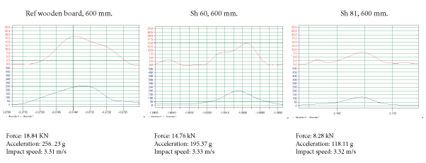 当评估钢体动态冲击后的十种层粘连蛋白溶液时(图1a),目前的结果中显示了其中两种。使用聚合物Sh 60,力从参考木板(图3)中的18.84 kN减小到14.76 kN或22%,而聚合物Sh 81将力减小到8.28 kN 56%。此外,与加速度为256.23 g的参考木板相比,聚合物Sh 60将加速度降低至195.37 g或平移加速度降低24%,而聚合物Sh 81将平移加速度降低至118.11 g或54%。对照木板和两个聚合物结构之间的冲击速度在3.3m/s或12km/h左右没有差异。