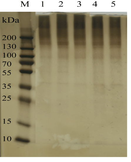 图7:使用Hybrid III头测试层粘连蛋白样品的SDS页面。M巷是分子标记,在1-3巷和4-5巷分别显示了用Sh50聚合物实验得到的层粘连蛋白样品。