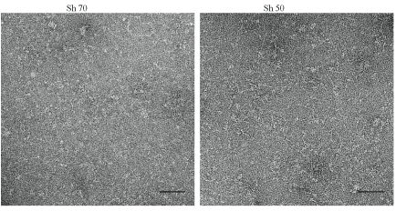 图8:层粘连蛋白与聚合物Sh 70和Sh 50的杂交头状结构动态碰撞后的电镜检查。比例尺50纳米。