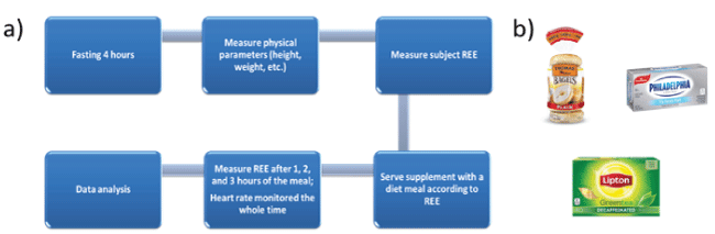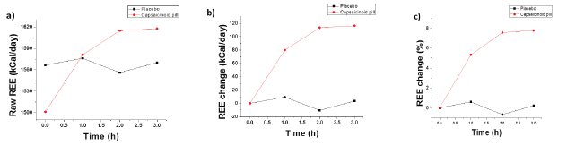 在每次测试之前,参与者在过去4小时内没有进食,在测试前12小时内没有进行剧烈运动,或者在测试前至少4小时没有进行中度运动。一旦确定了静息状态,就测量了参与者的REE。至少连续测量了2次REEaken以确保准确性。此外,使用Tanita生物阻抗量表和壁尺对参与者的体重、身高和脂肪百分比进行评估。之后,要求参与者佩戴Zephyr胸带跟踪器以监测其生理参数。向参与者提供膳食,包括无热量、无咖啡因的饮料k和一定量的Thomas素百吉饼和1/3低脂费城奶油奶酪(基于其REE水平)。14名参与者的热量摄入与REE值的比率为0.35,25名参与者为0.25。同时,参与者被提供一顶帽子或一个安慰剂胶囊。安慰剂模拟了大小和物理特性补充药丸的特点。每位参与者参加两次试验:一次服用CAP,另一次服用安慰剂胶囊。两次试验之间的研究是单盲的,至少有两天的清洗期。所有参与者的代谢率分别在1小时、2小时和3小时进行测量。开始和结束的时间试验结束时,在试验的空白时间内,受试者需要进行固定的办公室或工作台,在图2a中对试验方案进行了总结。根据相同的数据集,绘制了图3b和3c,以比较两组在同一水平上的差异。作为该参与者的基线。REE0表示基线REE值,REEI表示在1小时,2小时和3小时下测量的REE值。数据计算为:[(REE我- 雷伊0) /瑞0) * 100%。