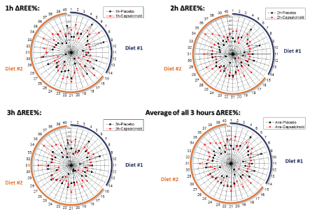 个体参与者REE变化:每个个体的代谢率是独特的。图4显示了每个参与者的∆REE%。在图4中,雷达图外的标签表示了参与者的人数。在图4中,CAPs组比安慰剂组处于外周期。CAPs对代谢率有积极的影响。绝对面积积分结果如表2所示。在3小时内,CAPs组比安慰剂组显示了统计学上显著的正整合区域。在1 h时,CAPs的REE增加,在3 h时继续增加(从505%增加到1186%),表明CAPs比安慰剂提高代谢率。