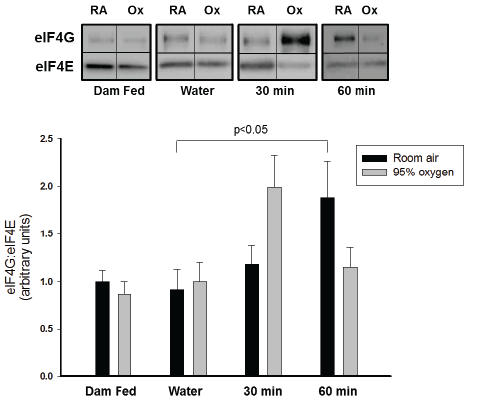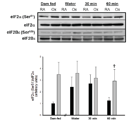 图6:95% O的效果2a)免疫印迹法表示eIF2α和eIF2Bε的相对磷酸化。B)直方图显示eIF2α在RA(黑色)和Ox(灰色)幼犬中的平均磷酸化水平。柱代表平均值(n=12)和柱代表SEM。在受损动物中,Ox的eIF2α磷酸化水平高于RA幼犬(p=0.08)。在两种环境中饲养的动物中,配方喂养均不能改变eIF2α的磷酸化。“†”表示RA与OX在60 min时存在显著差异(p<0.05)。