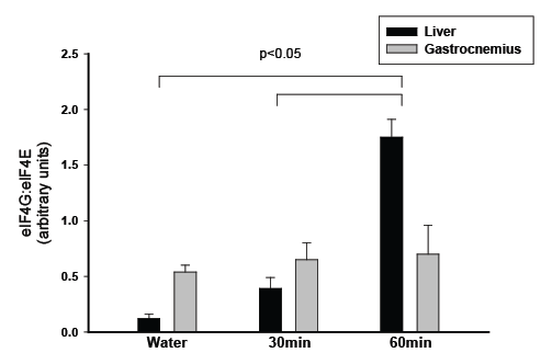图4:饲喂可诱导eIF4F在肝脏内组装。电泳分离亲和纯化的肝脏和腓肠肌提取物,测定eIF4G与eIF4E共沉淀的量。A组显示了来自单个动物的每个组织的具有代表性的免疫印迹。B)柱状图显示eIF4G与eIF4E的相对结合。柱代表平均值±扫描电镜(n=3)和柱状扫描电镜。统计分析显示,饲喂eIF4G 60 min后:30 min时,相对于水饲或粉饲幼犬,eIF4E结合量增加(p<0.05, t检验)。