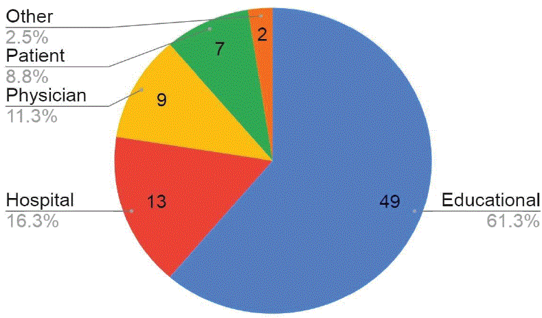 图2显示了上传的视频的来源。大部分视频是通过教育频道上传的,61.3%(49个)。其余视频由医院上传16.3%(13个视频),医师上传11.3%(9个视频),患者上传8.8%(7个视频),2.5%(2个视频)由其他来源上传。