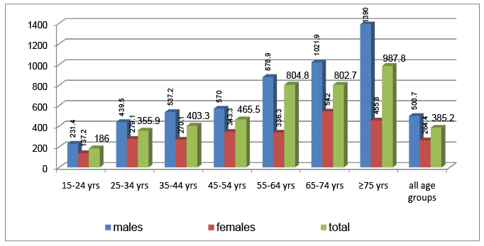 正如预期的那样,这种疾病的流行程度在不同年龄组之间有所不同。15-24岁年龄组(最低)的校正患病率为186/100000人,并逐渐增加:25-34岁年龄组为355.9/ 100000人;35-44岁(年龄组)403.3/100,000;45-54岁年龄组为465.5/100,000;55-64岁年龄组804.8/100,000;65-74岁年龄组为802.7/100,000,≥75岁年龄组为987.8/100,000。各年龄组患病率差异有统计学意义卡方=28.90;p < 0.0001(图3)。