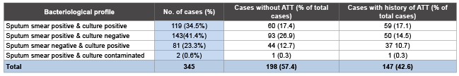 264/345例(76.5%)痰AFB阳性(斑点/过夜或两者均阳性)。对两份标本进行痰培养(LJ培养基)。57.98%(200/345)的病例中发现了经生物化学检测的结核分枝杆菌(表3)。受污染培养样品的比例为0.6%(在可接受范围内)。