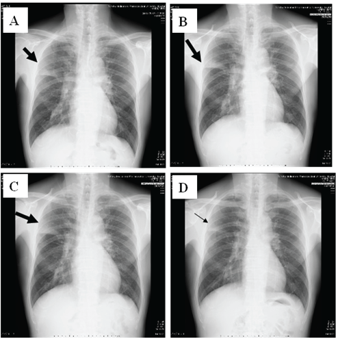 图2:患者的胸部X光改变。分别为A:1天、B:4天、C:7天和D:11天。右上视野的浸润阴影在第1天和第4天没有改变,但在第7天恶化。但是,在使用甲基强的松龙后,在第11天有所改善。