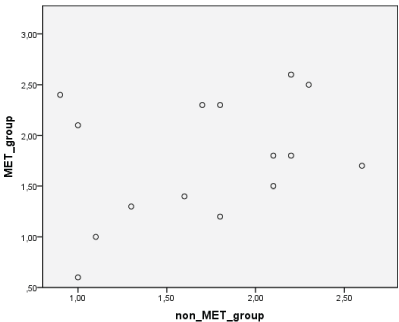 将MET组与非MET组进行比较,我们得出结论:MET治疗至少2个月后,乳酸血浓度无统计学差异(p>0.05)。MET组和非MET组的乳酸血浓度均在正常范围内(小于2.50 mmol/L)。
