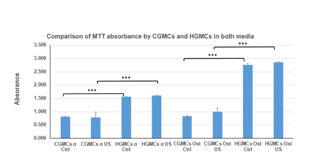 图1c:在alpha和成骨培养基中,CGMCs和HGMCs的MTT吸光度比较。* * * = P < 0.001。