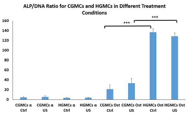 图3:应用LIPUS前后alpha和成骨培养基中CGMCs和HGMCs的ALP检测比较* * * = P < 0.001。