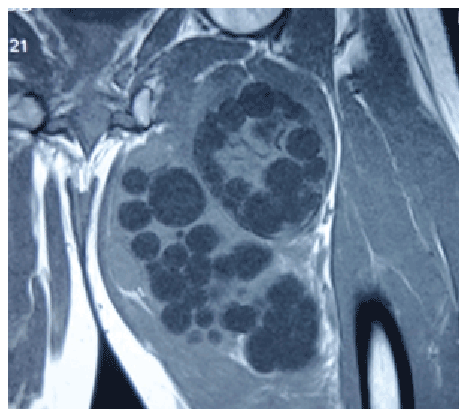 常规血液调查,腹部的超声波和胸部的X射线是正常的。该地区的超声显示多象肿胀。肿胀的FNAc显示出囊性病变,并报告为寄生或淋巴囊肿。在血清学试验中,用值为74.20 IU升高液体的IgG。大腿的MRI揭示了左大腿内膜肌肉舱中的多次大,多象型肿块。最大的囊肿的尺寸为83×69×103mm。看到多种可变的囊肿除以隔膜。没有发现明显的骨骼或关节参与图2. MRI特征旨在提示包发虫质量。
