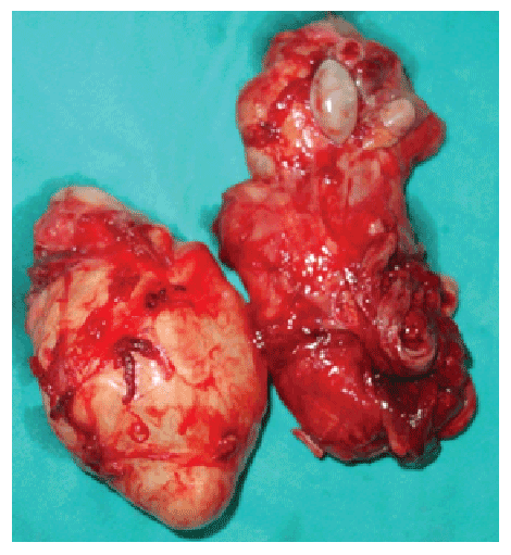 病人在全身麻醉下手术。左大腿内侧发现包虫囊肿,约25 × 15 × 15 cm,内收肌室有多个子囊肿(图3和图4)。未发现神经血管受累。小心避免溅出。将浸泡了10%碘化钾的拖把置于囊肿周围,灌注3% NaCl的高渗盐水。胆囊周切除术并放置引流管。